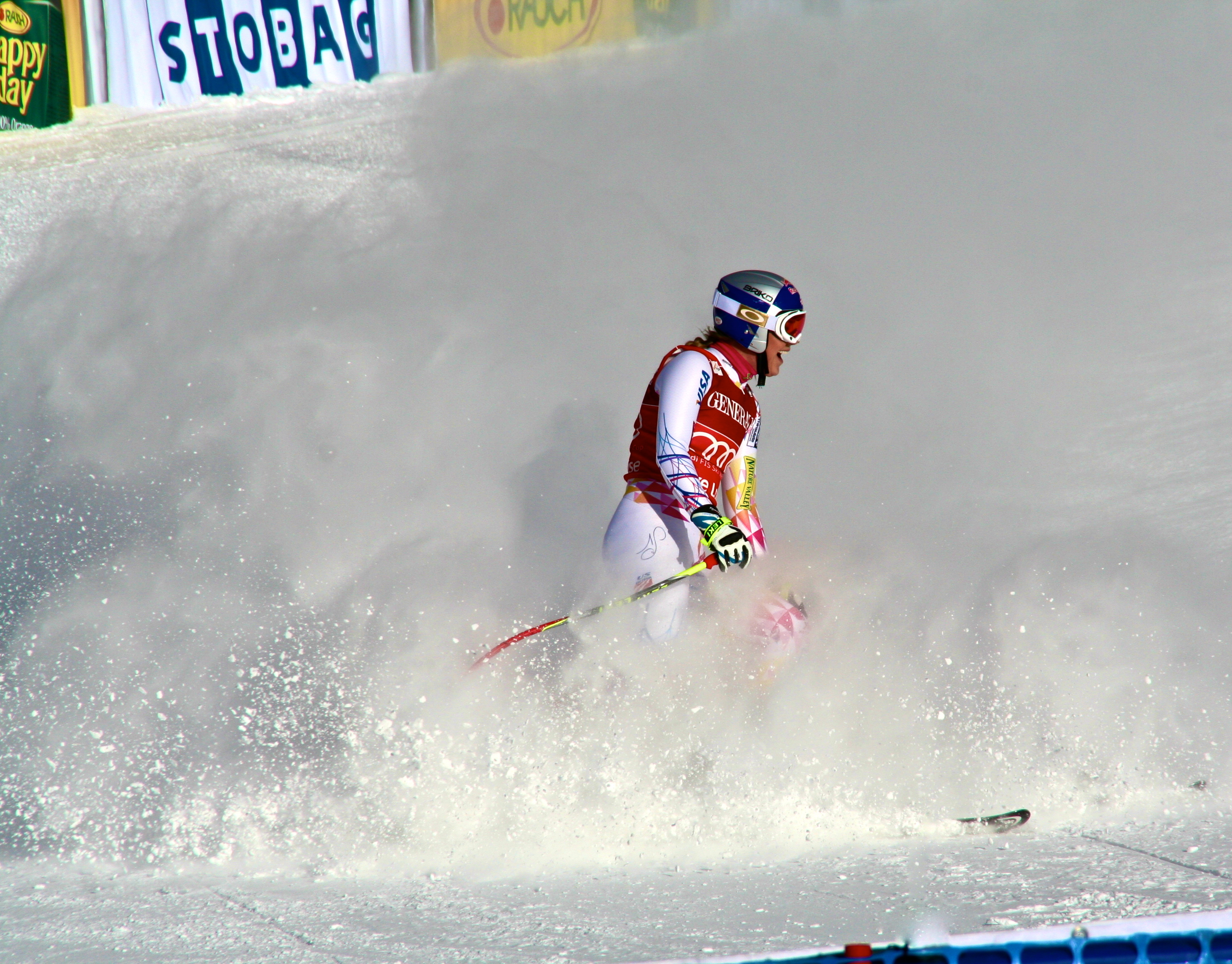 Last weekend we stole away to Banff for our family’s annual weekend away (to celebrate the Dutch festival of Sinterklaas – not quite the exact date but we’re not purists on this one). While in Banff, we found out the World Cup women’s downhill race was going on at Lake Louise and took in the event. What a great time, especially watching U.S. skier Lindsay Vonn demolish the rest of the field, beating her nearest competitor by nearly two seconds (a lifetime in downhill skiing). Here’s a couple of photos of Vonn finishing the race.