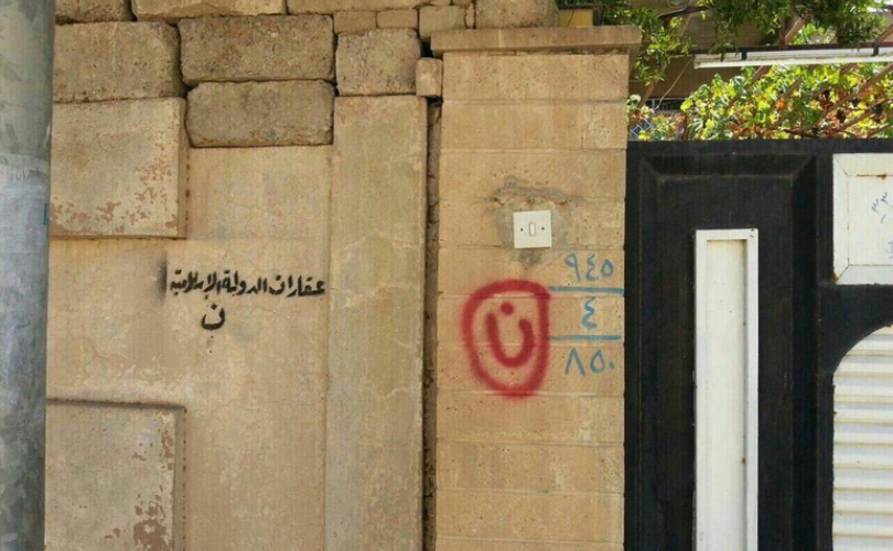 That’s no happy face there – it’s the current yellow badge, or Judenstern, of Iraq. The N’, or ن in Arabic, is the symbol used by the Islamic State (ISIS) to identify who is a Nazarene – a Christian. It has been drawn on doorways and painted on house-fronts in captured Iraqi cities, allowing ISIS militia to sort through identities and loyalties.
